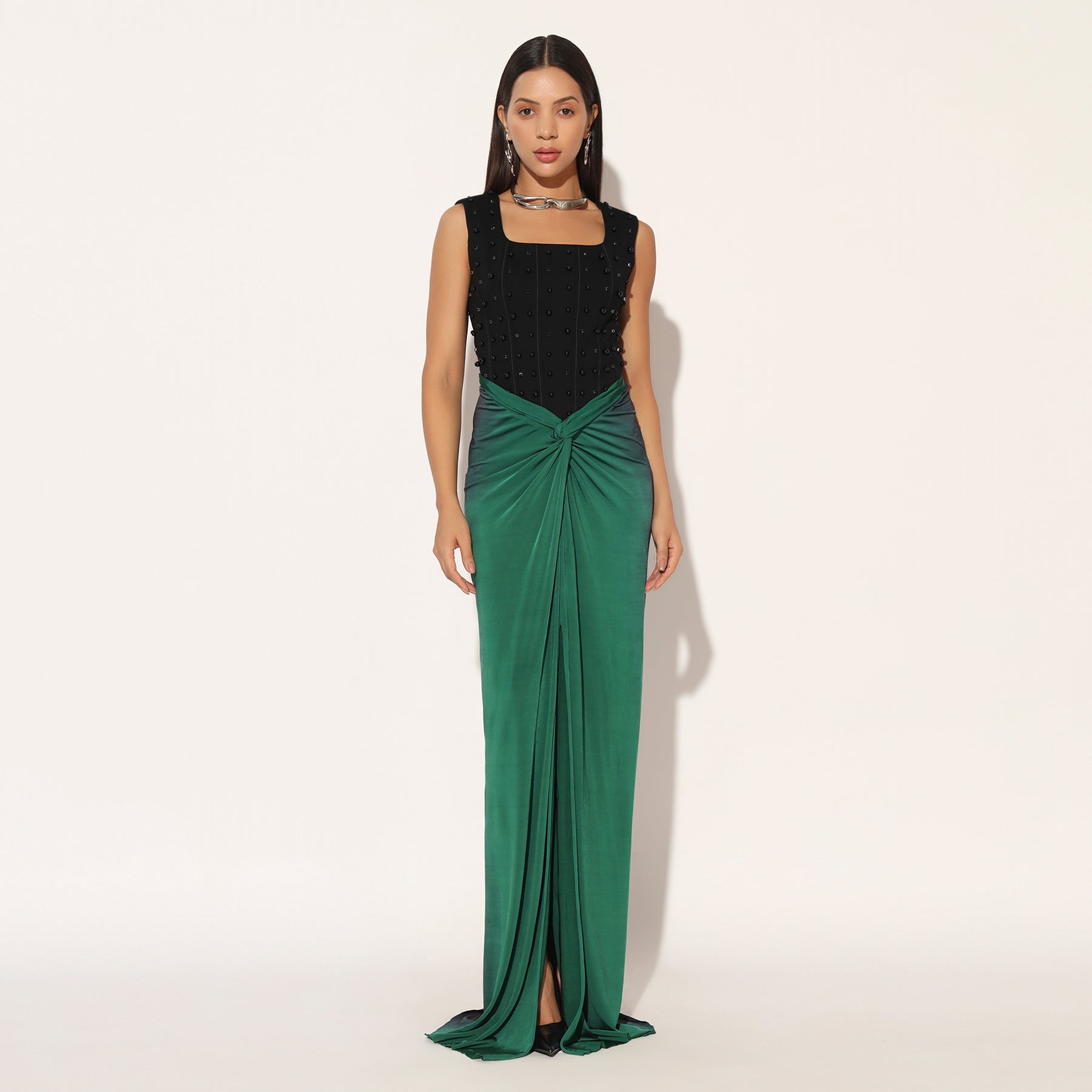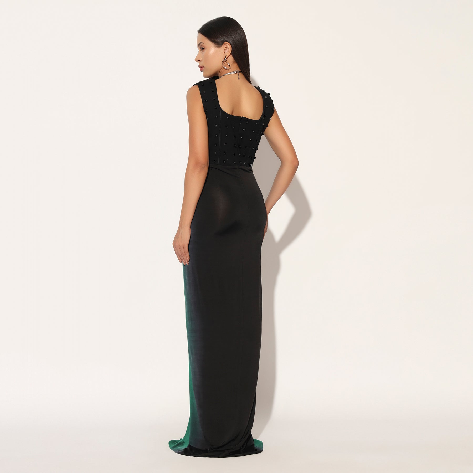 CORSETTED GOWN WITH EMBELISHMENT AND PLACEMENT HAND DYEING