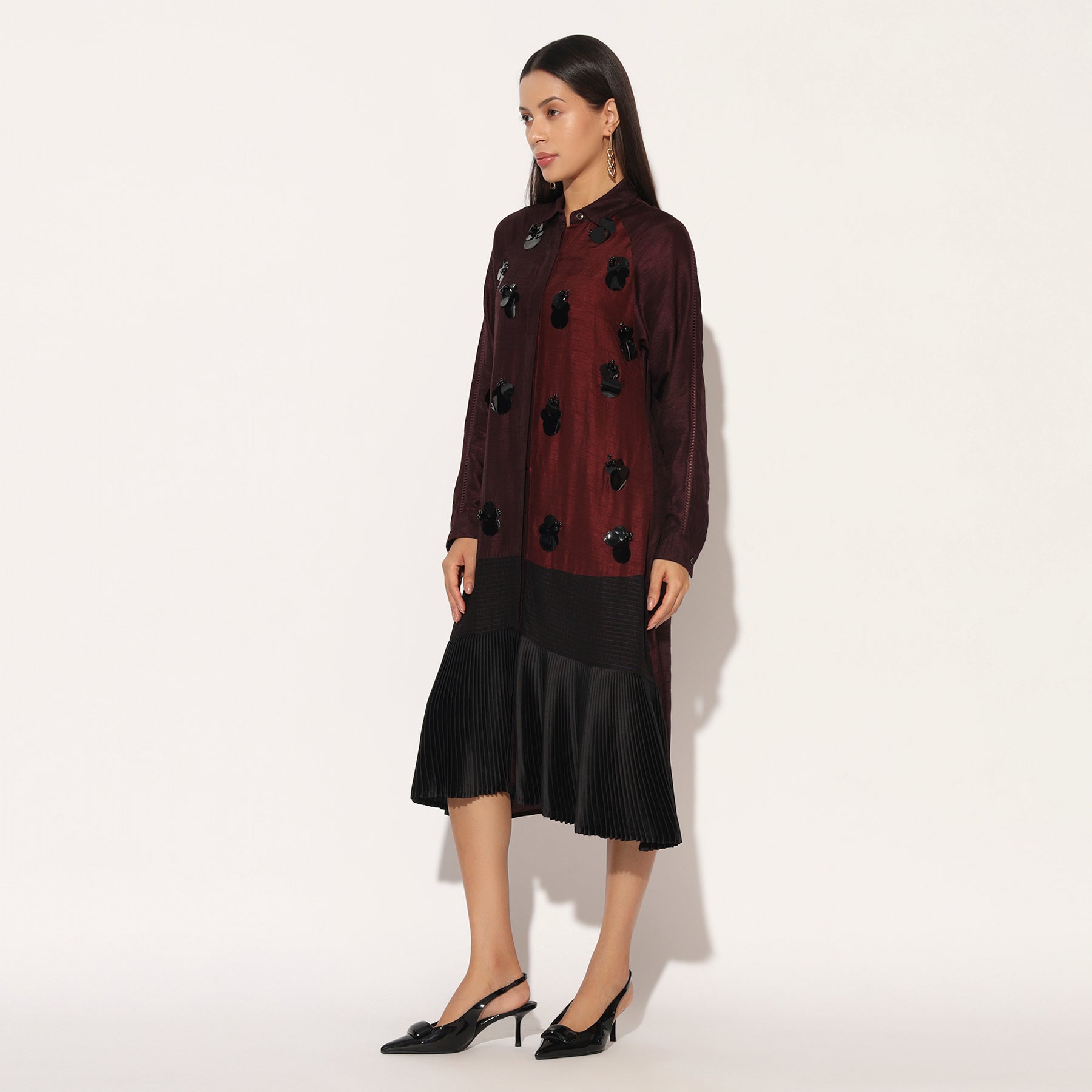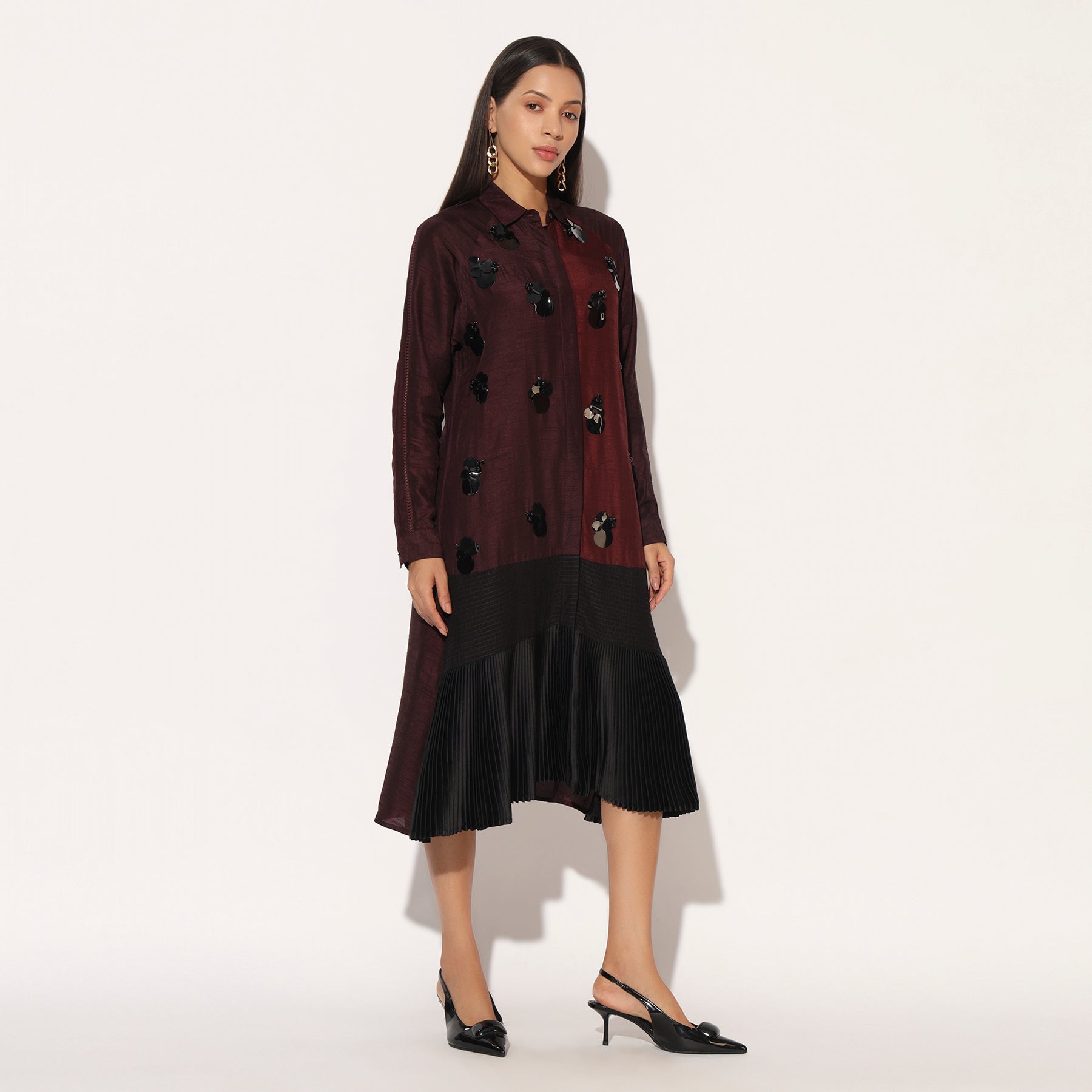 COLOUR BLOCKED SHIRTDRESS WITH PLEATED HEM AND MODERN EMBELLISHMENT