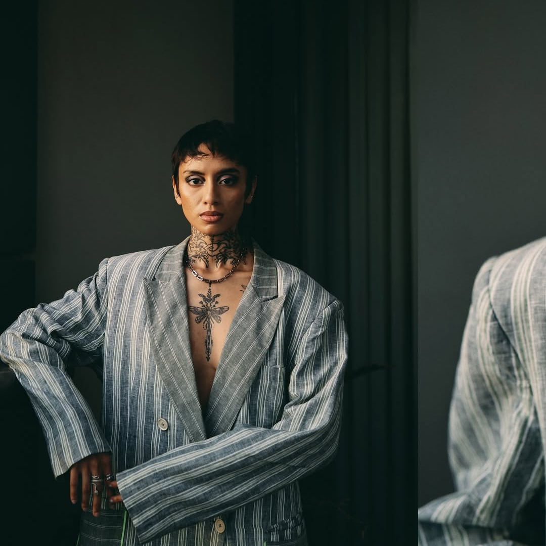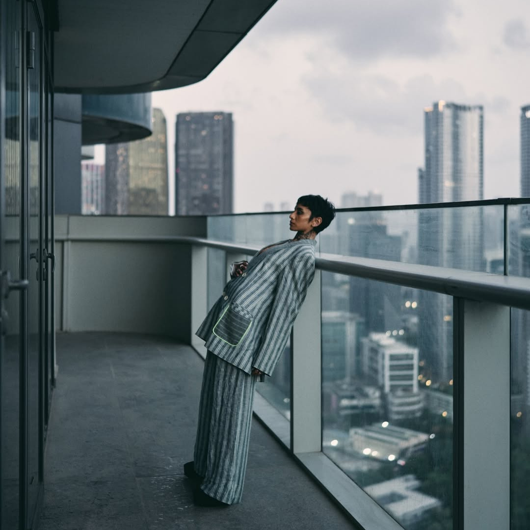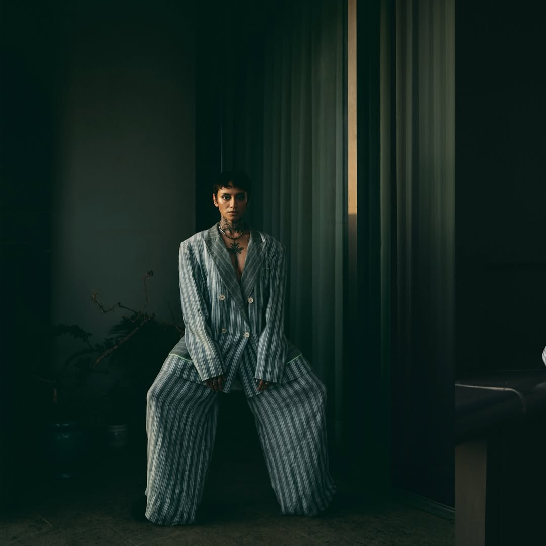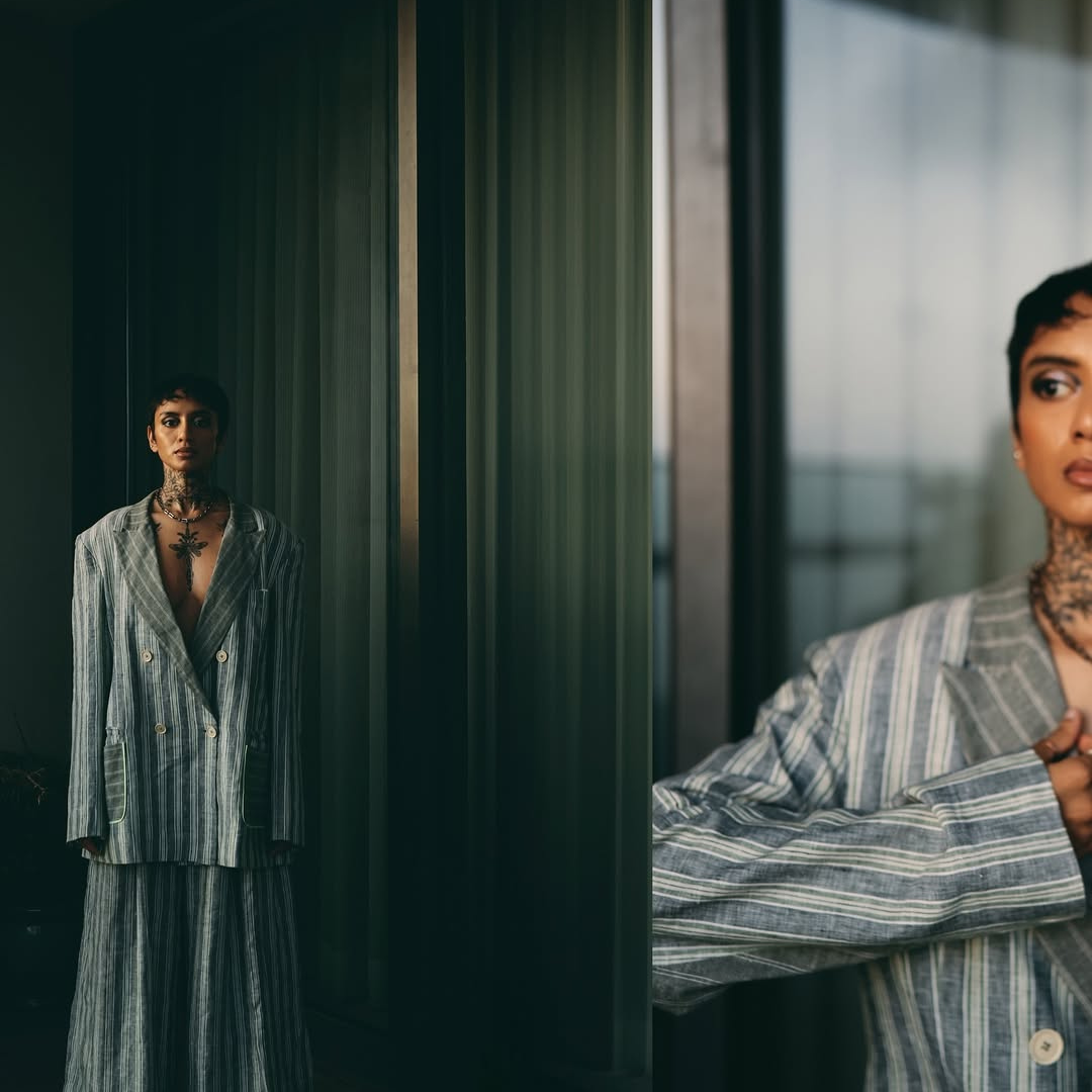 A CHIC SUMMER PANTSUIT, EASY FIT BLAZER WITH STRIPE DETAILING ALONG WITH A WIDE LEG DRAWSTRING STYLE TROUSER