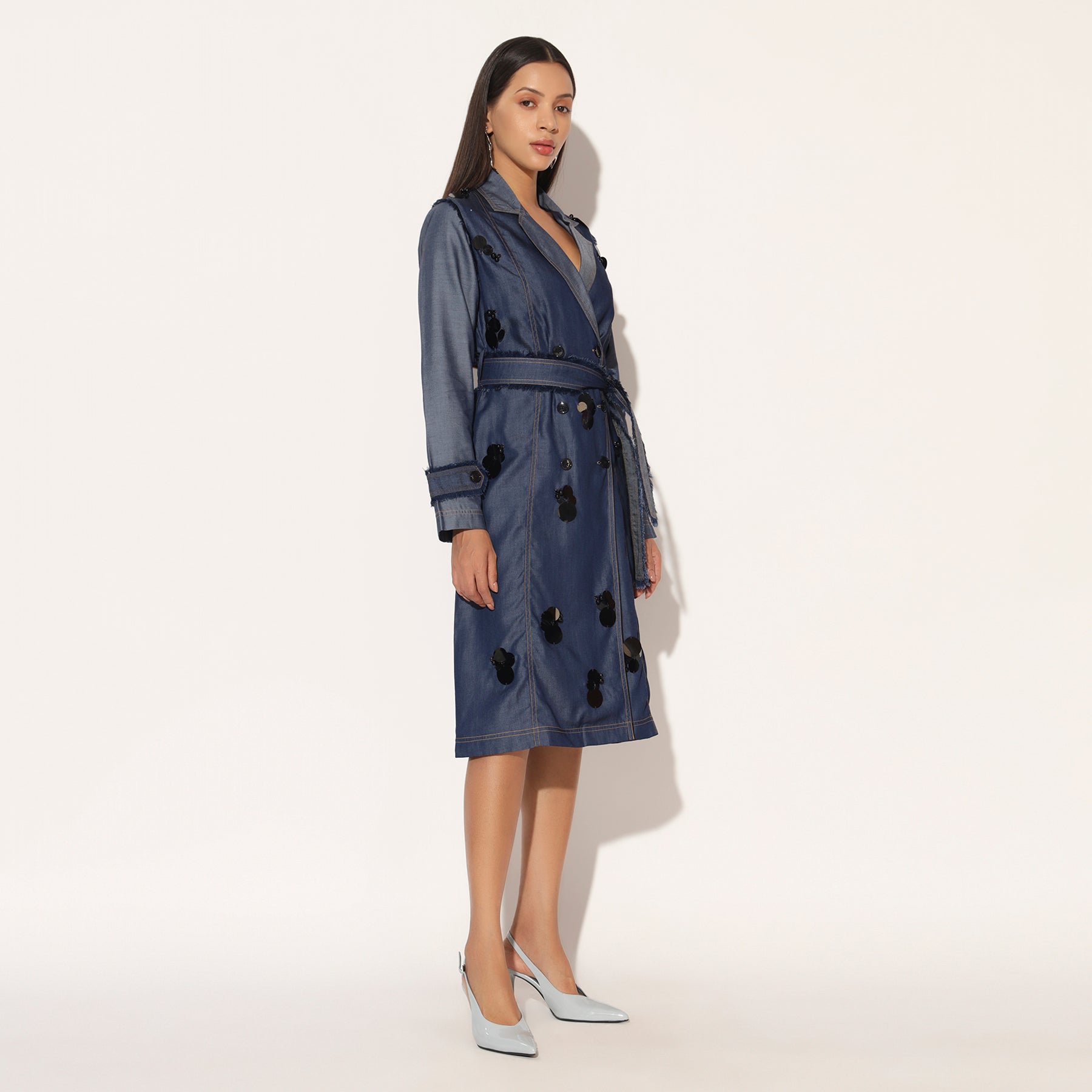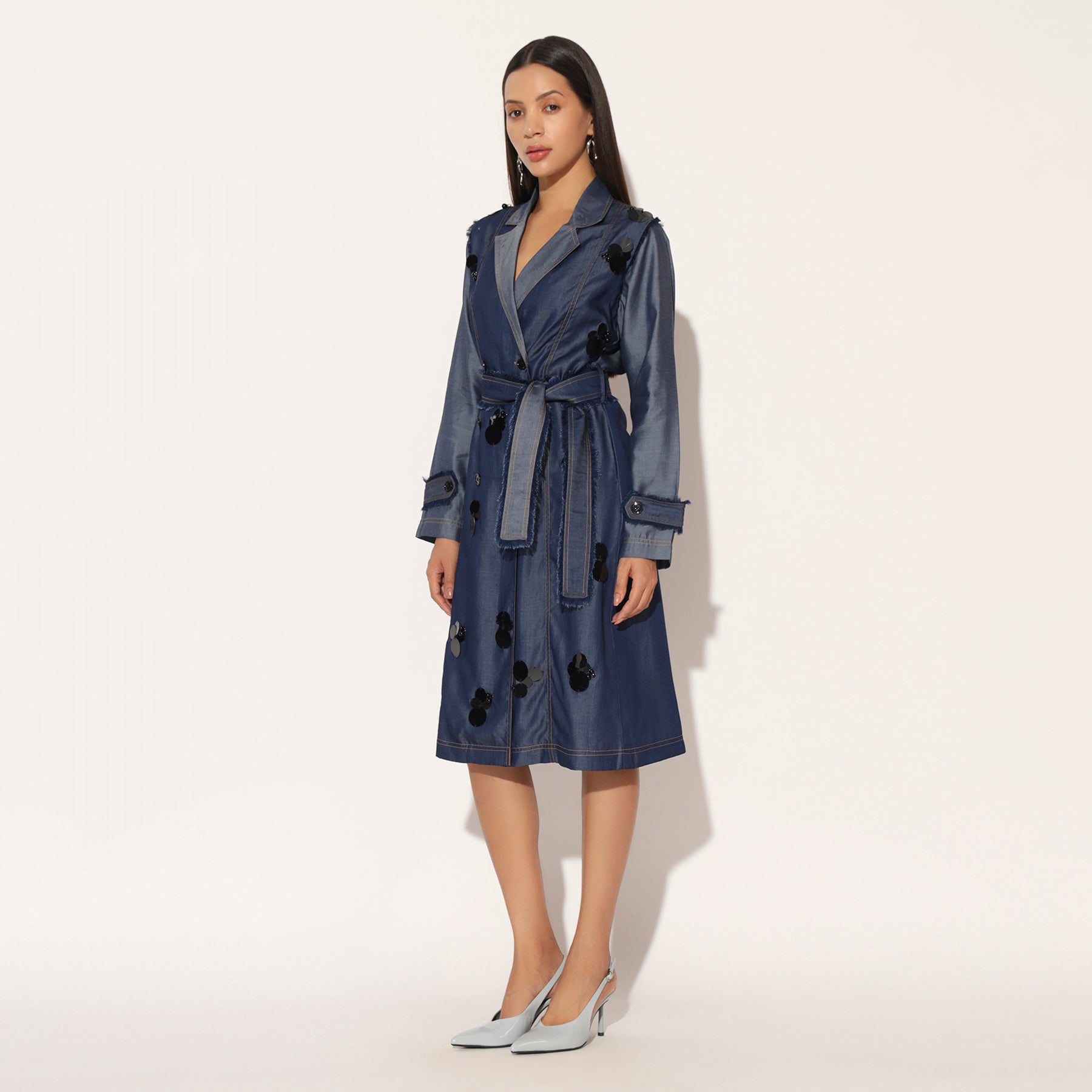 WRAP STYLE TRENCH DRESS IN LIGHT DENIM WITH ABSTRACT HAND DONE EMBELLISHED MOTIFS