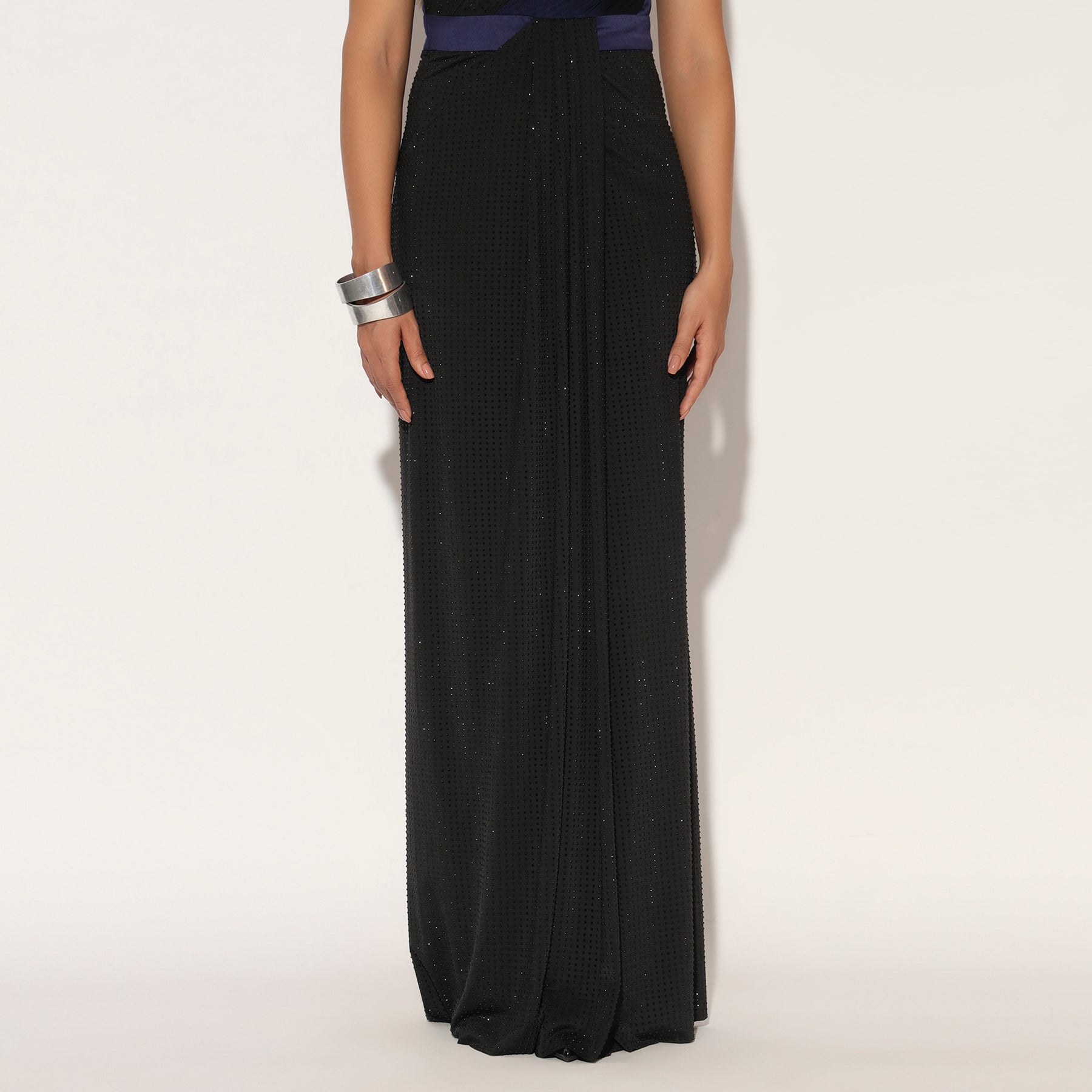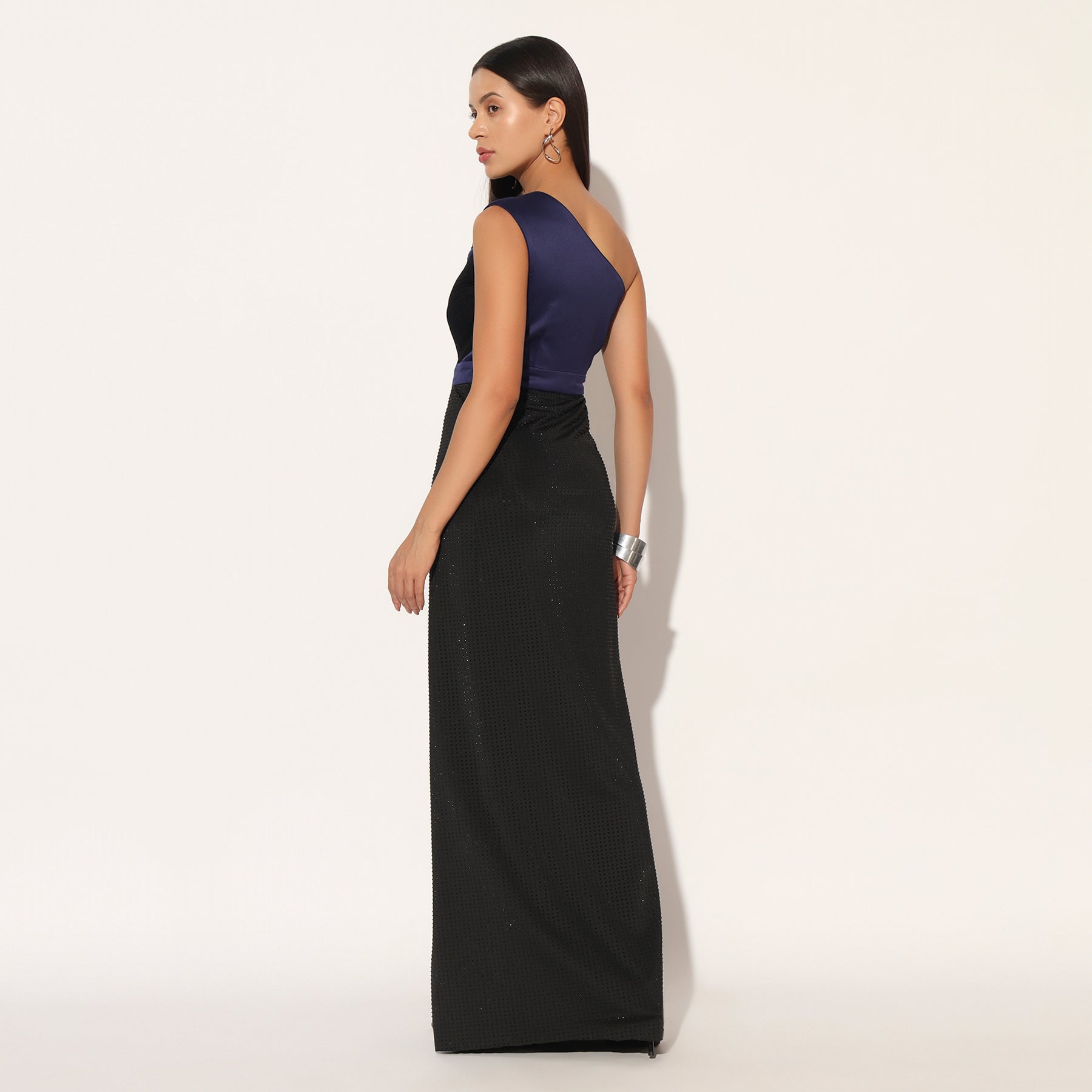 ONE SHOULDER GOWN WITH DRAPE DETAIL AND MICRO ALL OVER EMBELLISHED FABRIC