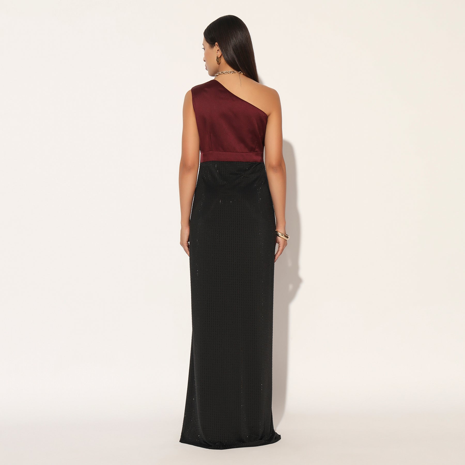 ONE SHOULDER GOWN WITH DRAPE DETAIL AND MICRO ALL OVER EMBELLISHED FABRIC