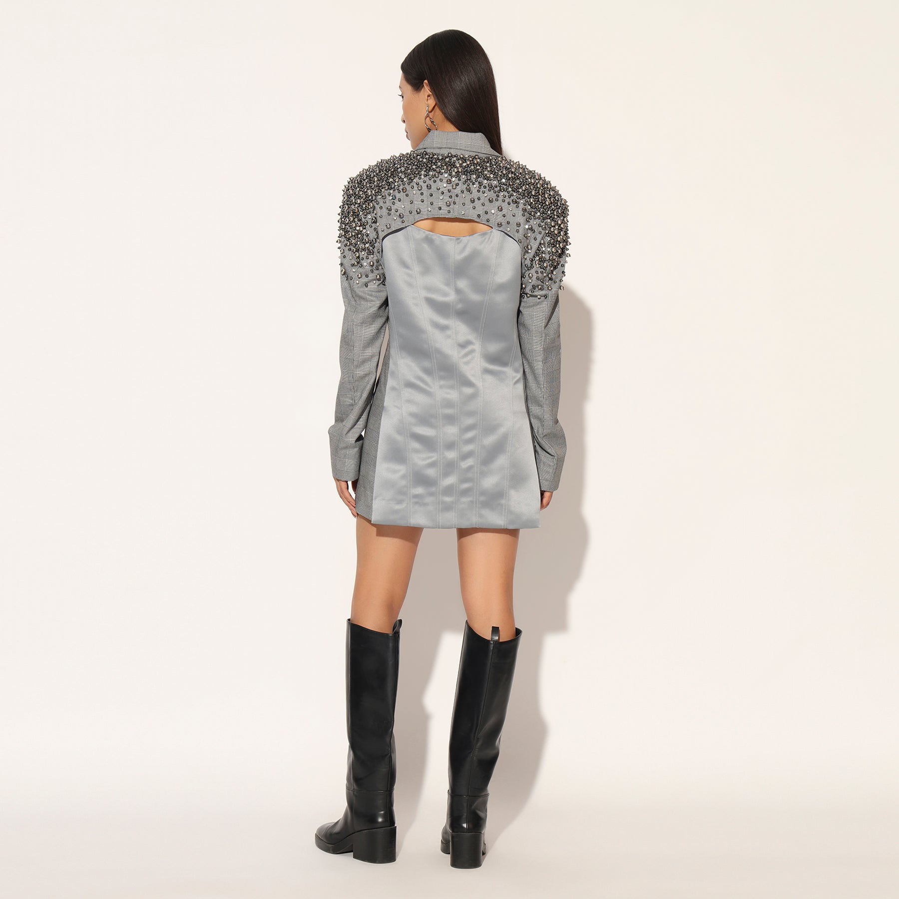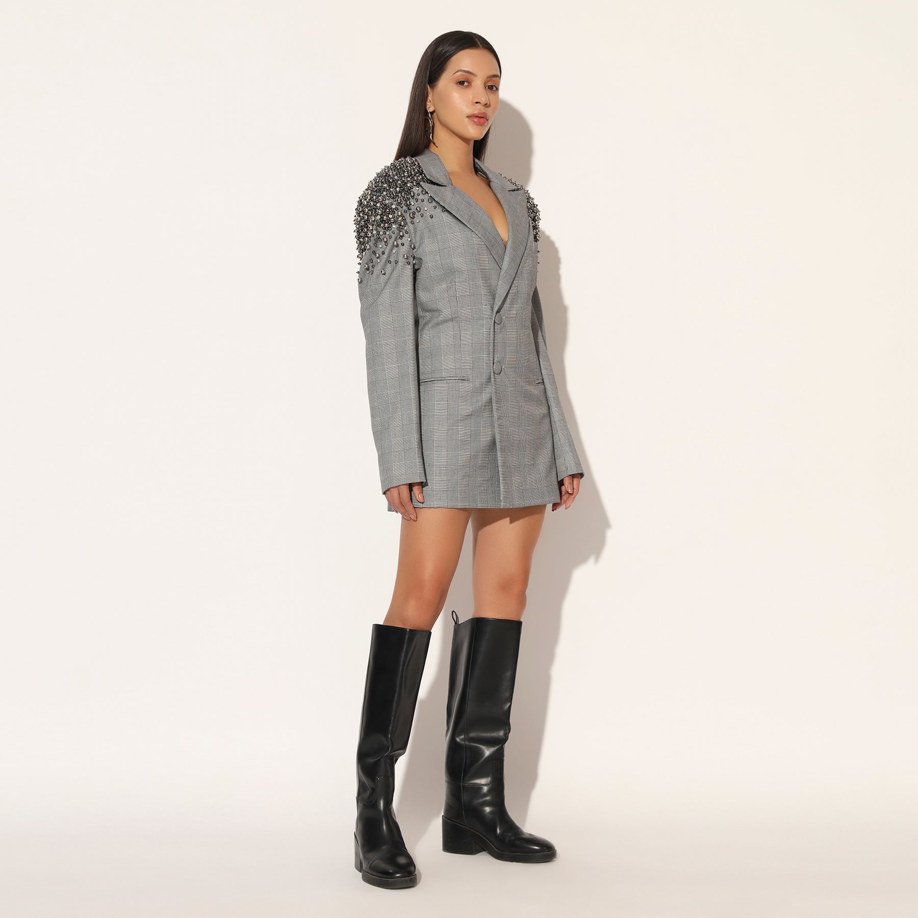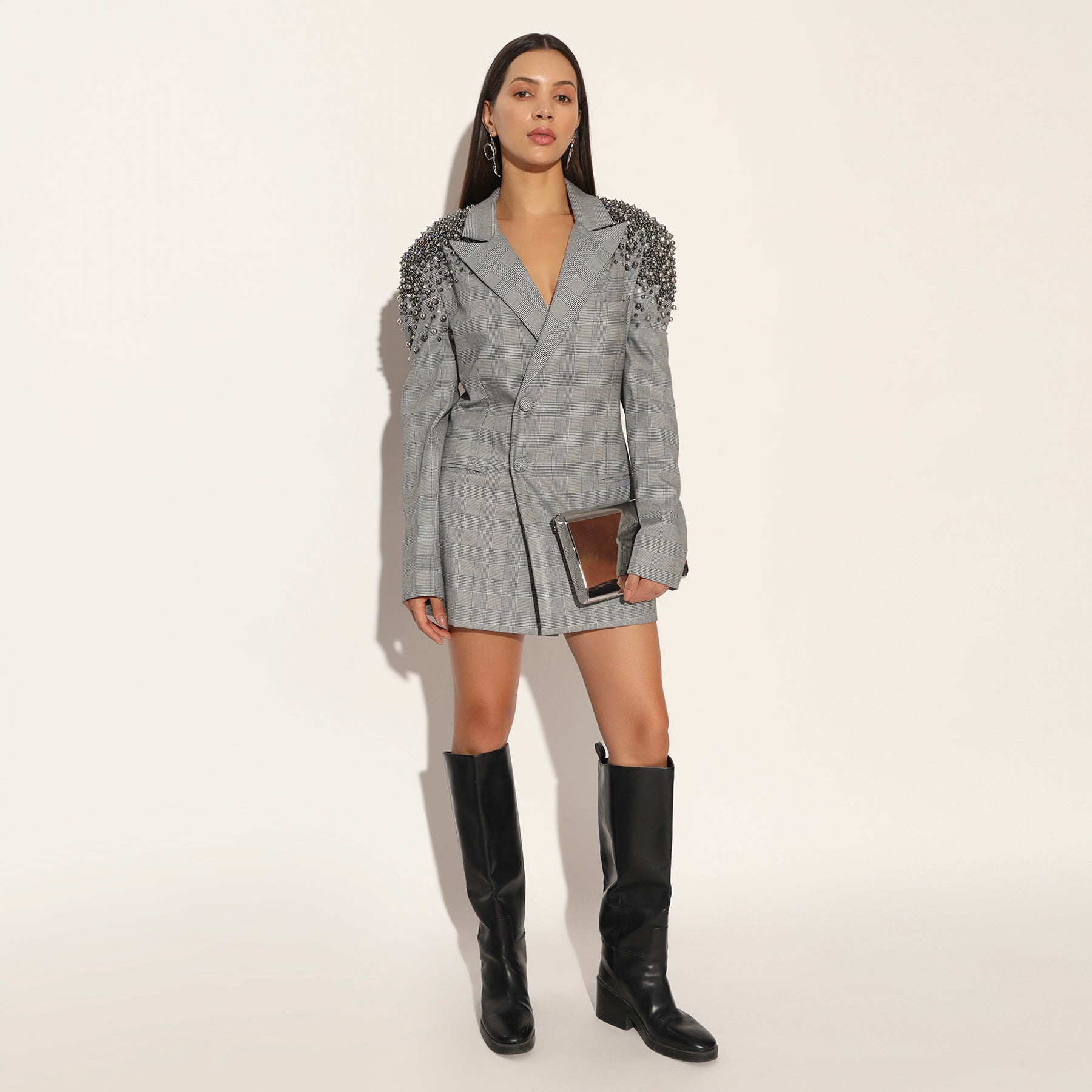 STRUCTURED JACKET DRESS WITH INTRICATE HAND DONE ABSTRACT EMBELLISHMENT ON SHOULDERS
