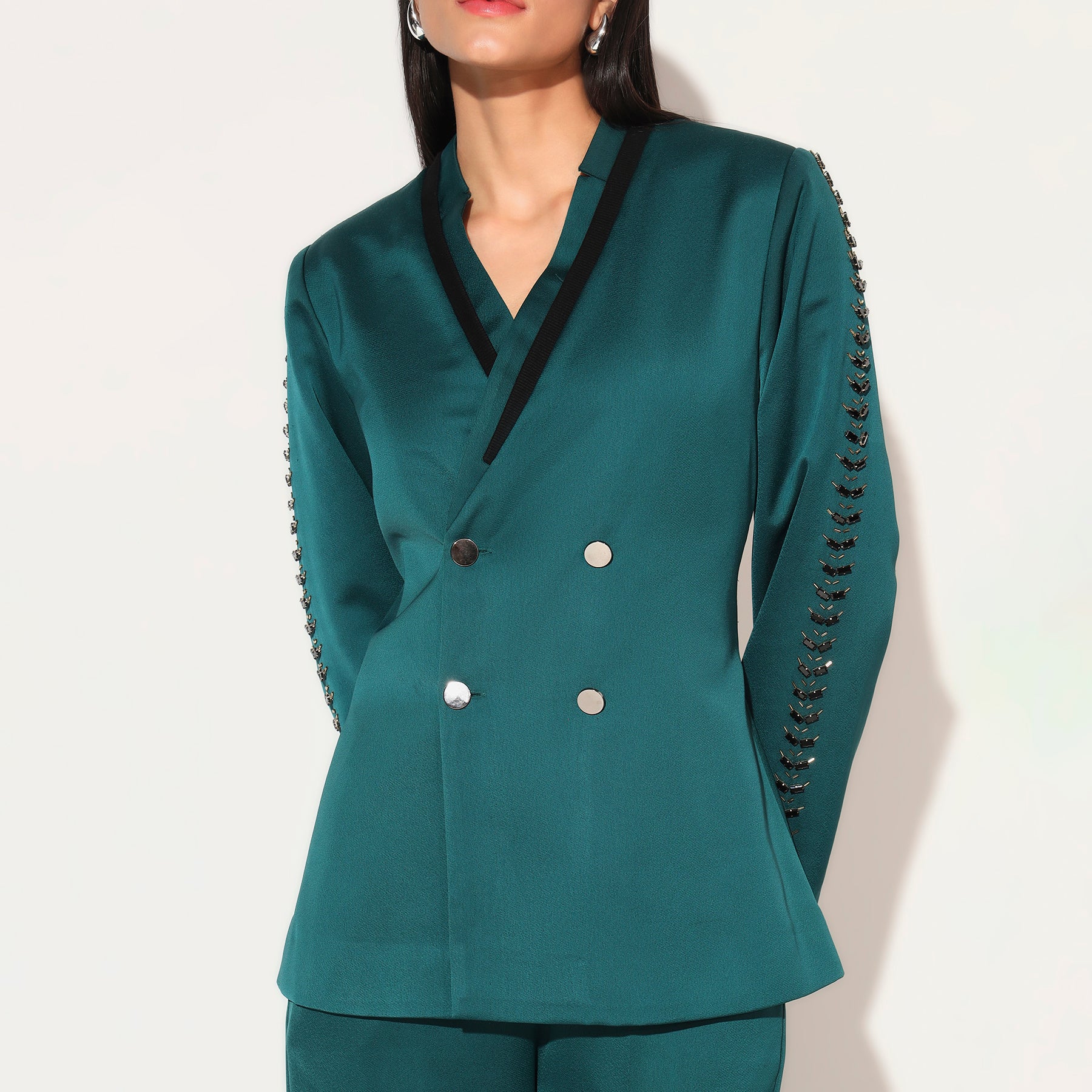 CLASSIC EVENING PANSTUIT STYLE WITH EMBELLISHED SLEEVES AND GOLD BUTTONS