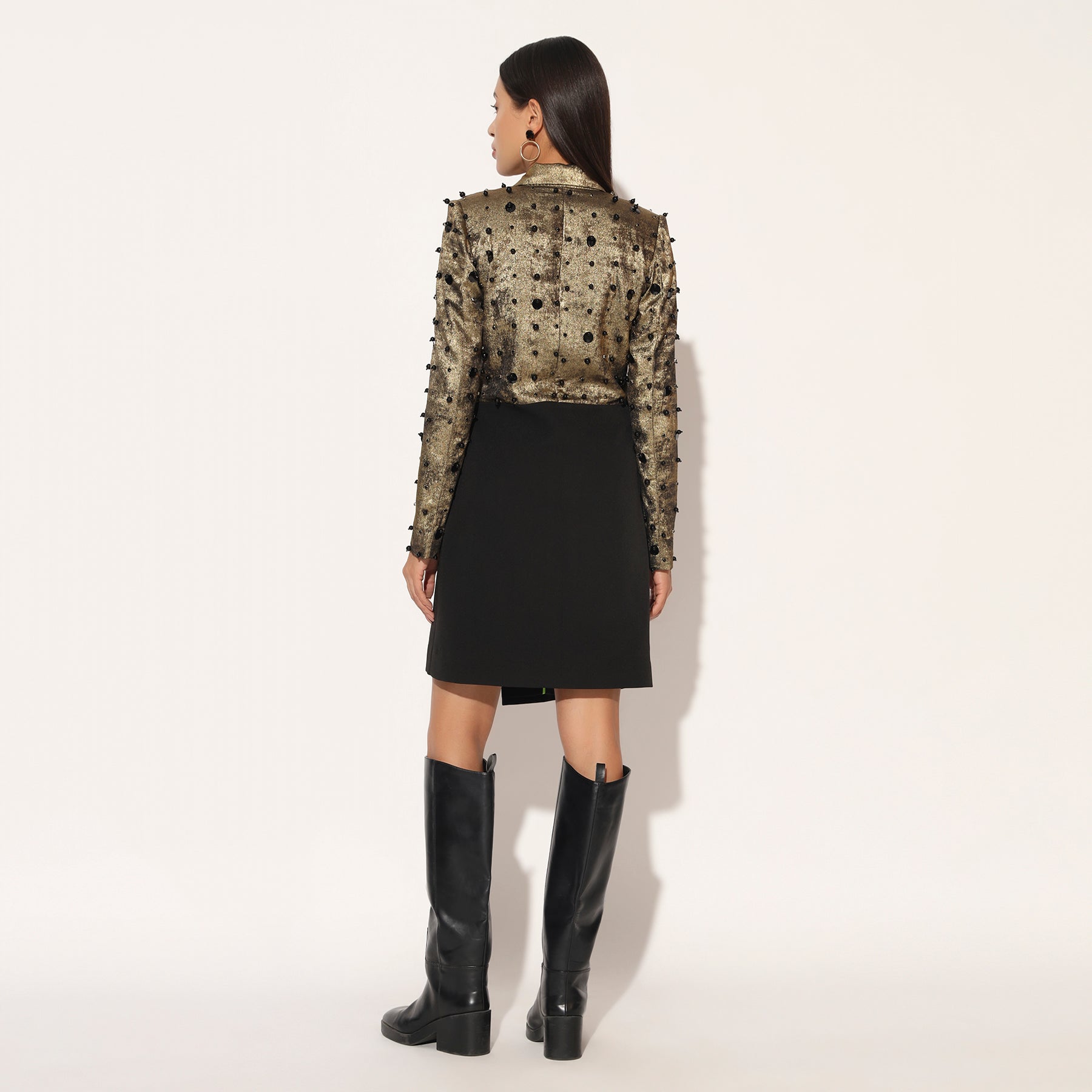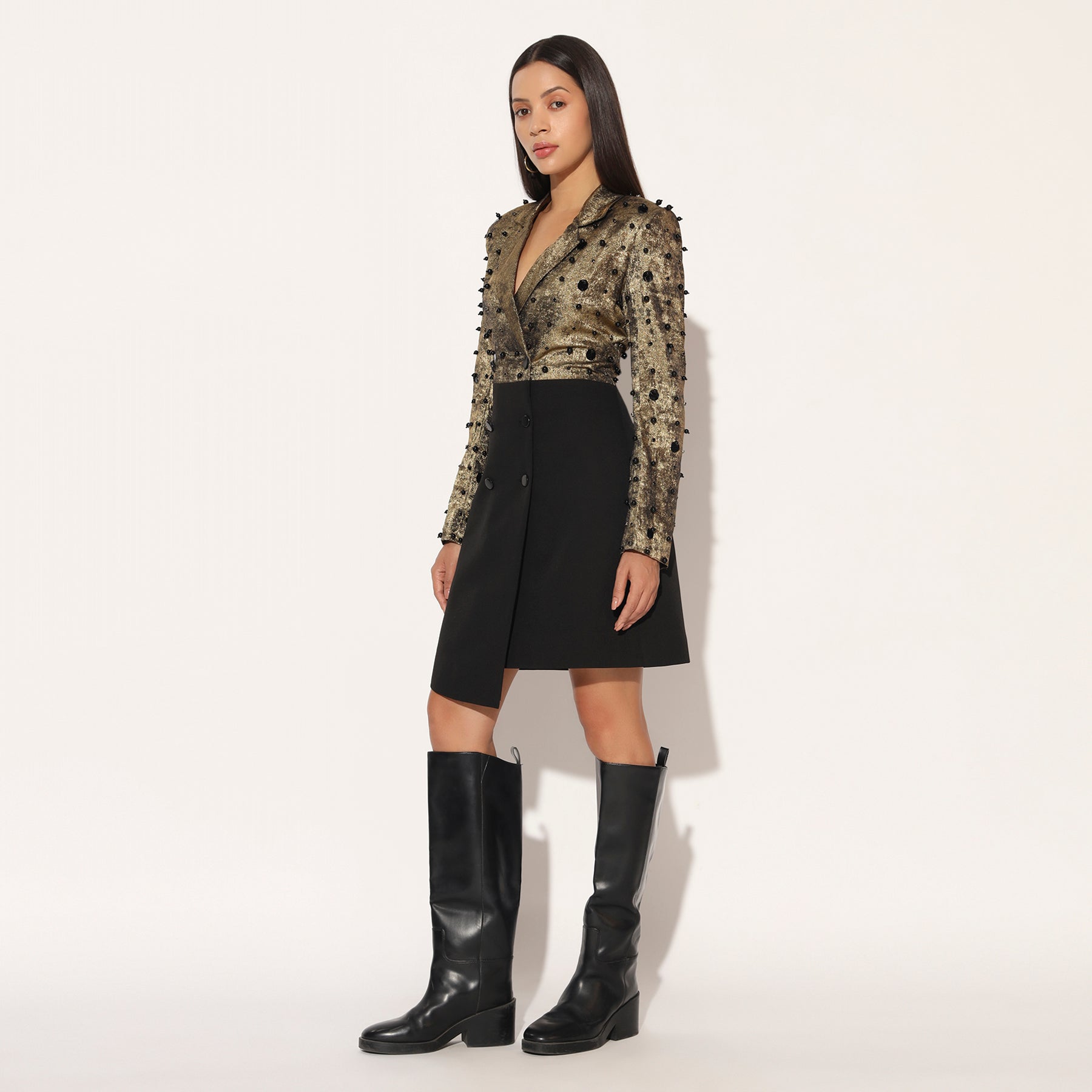 COLOUR BLOCKED JACKET DRESS WITH SUBTLE SHINE AND MODERN GRID EMBELLISHMENT